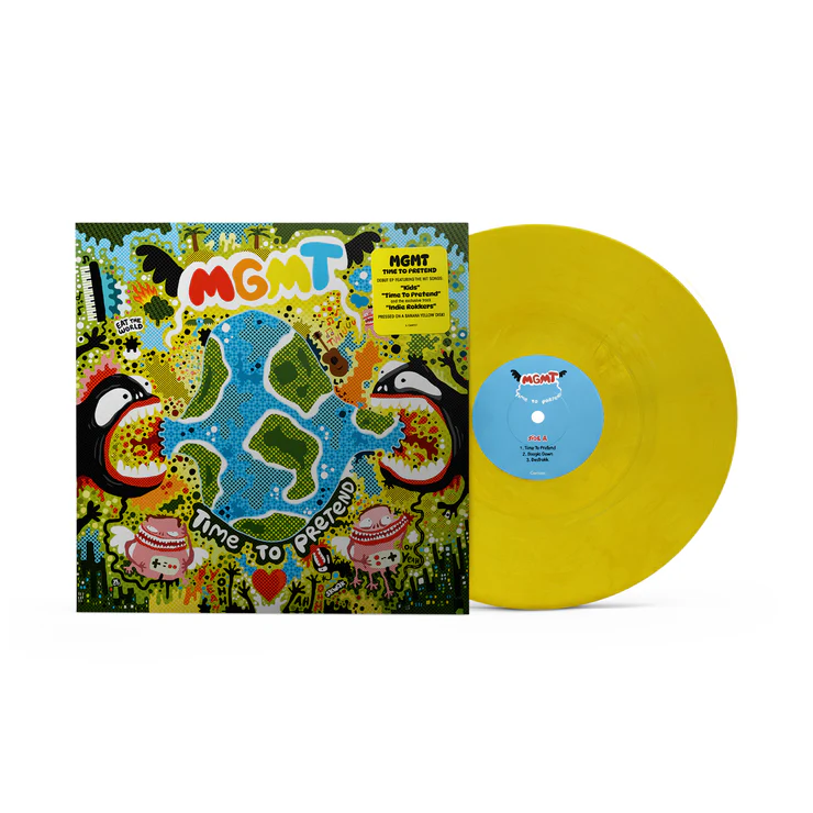 To celebrate the 20th anniversary of MGMT's debut EP, Time to Pretend, the band's early work is being revived on vinyl for the first time in a decade. Featuring unique, hand-made versions of the hit songs "Kids," and "Time to Pretend," the 6-song set is pressed on banana yellow vinyl with original artwork by the French visual artist SKWAK.