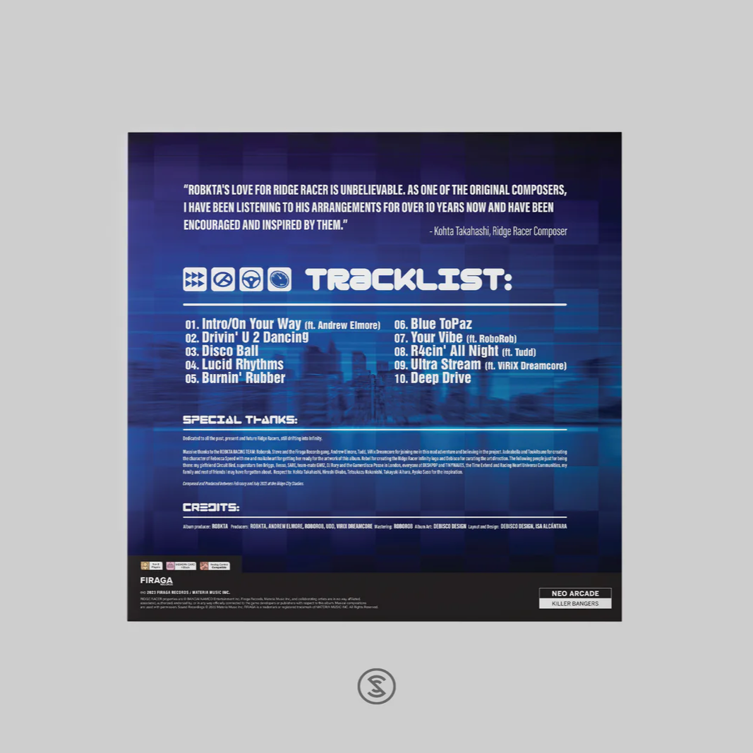 RoBKTA's latest Neo Arcade remix album “Ridge Racer Infinity” is an unmissable collection of high octane driving jams and a worthy tribute to the classic arcade racing series Ridge Racer. Songs featured on the 10 track album include On Your Way (from "R4: Ridge Racer Type 4"), Drivin' U 2 Dancin' (from "Ridge Racer Revolution"), and Blue Topaz (from "Rave Racer")with collaborations from Andrew Elmore, Tudd, RoboRob, and Virix Dreamcore.