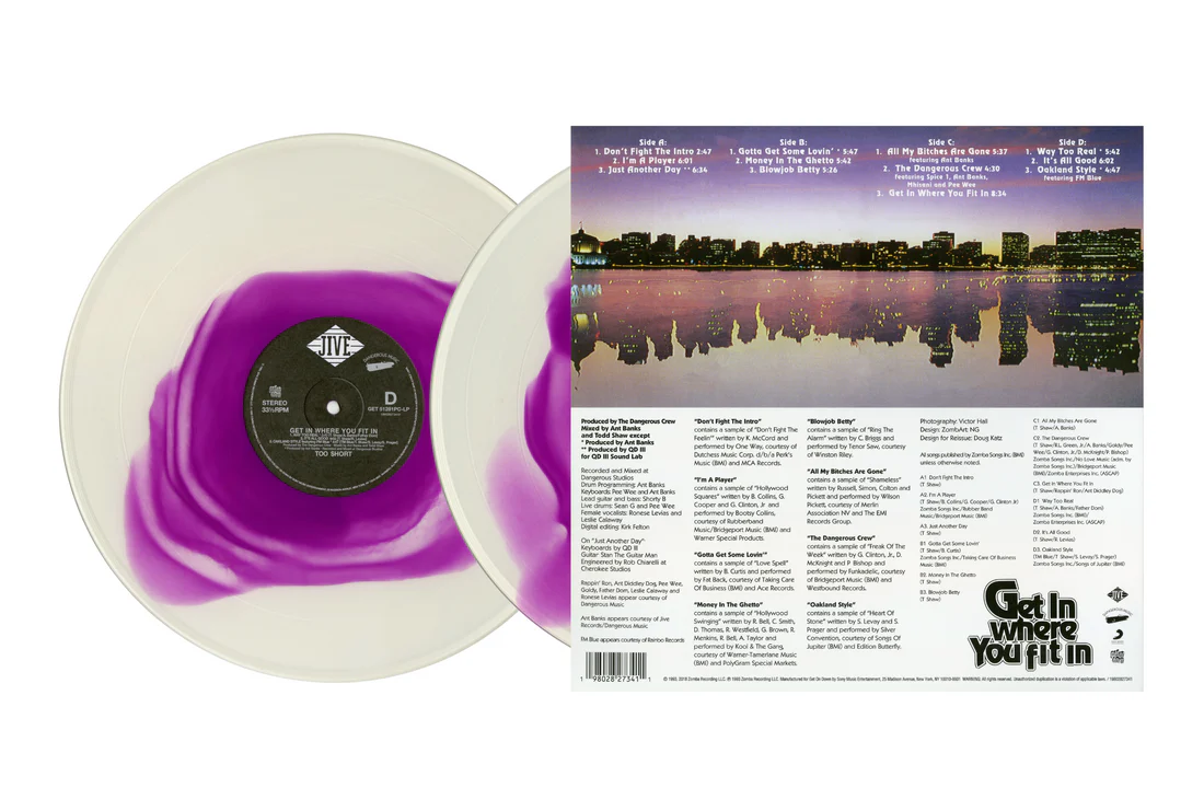 Too $hort's 8th studio album, Get In Where You Fit In, was originally released in October of 1993 and would be his fourth album in a row to be certified platinum.  Production was handled by Ant Banks and The Dangerous Crew, which featured live instrumentation, incorporated P-Funk samples, and G-Funk synths. The lead single "I'm a Player" sampled Bootsy Collins' funky bass of "Hollywood Squares" and Quincy Jones' son QDIII produced the epic Bay Area G-Funk laden classic track "Just Another Day".  And it wouldn't be a Too $hort record without some pimp and sex tales like "Blow Job Betty", "All My Bitches Are Gone" and the upbeat "Gotta Get Some Lovin". Bay Area legends Spice 1, Ant Banks, and Mhisani aka Goldy join in on the posse cut "The Dangerous Crew" followed by a track with more Bay Area legends Rappin' Ron and Ant Diddley Dog dissin' ex-Dangerous Crew member MC Pooh on the title track.