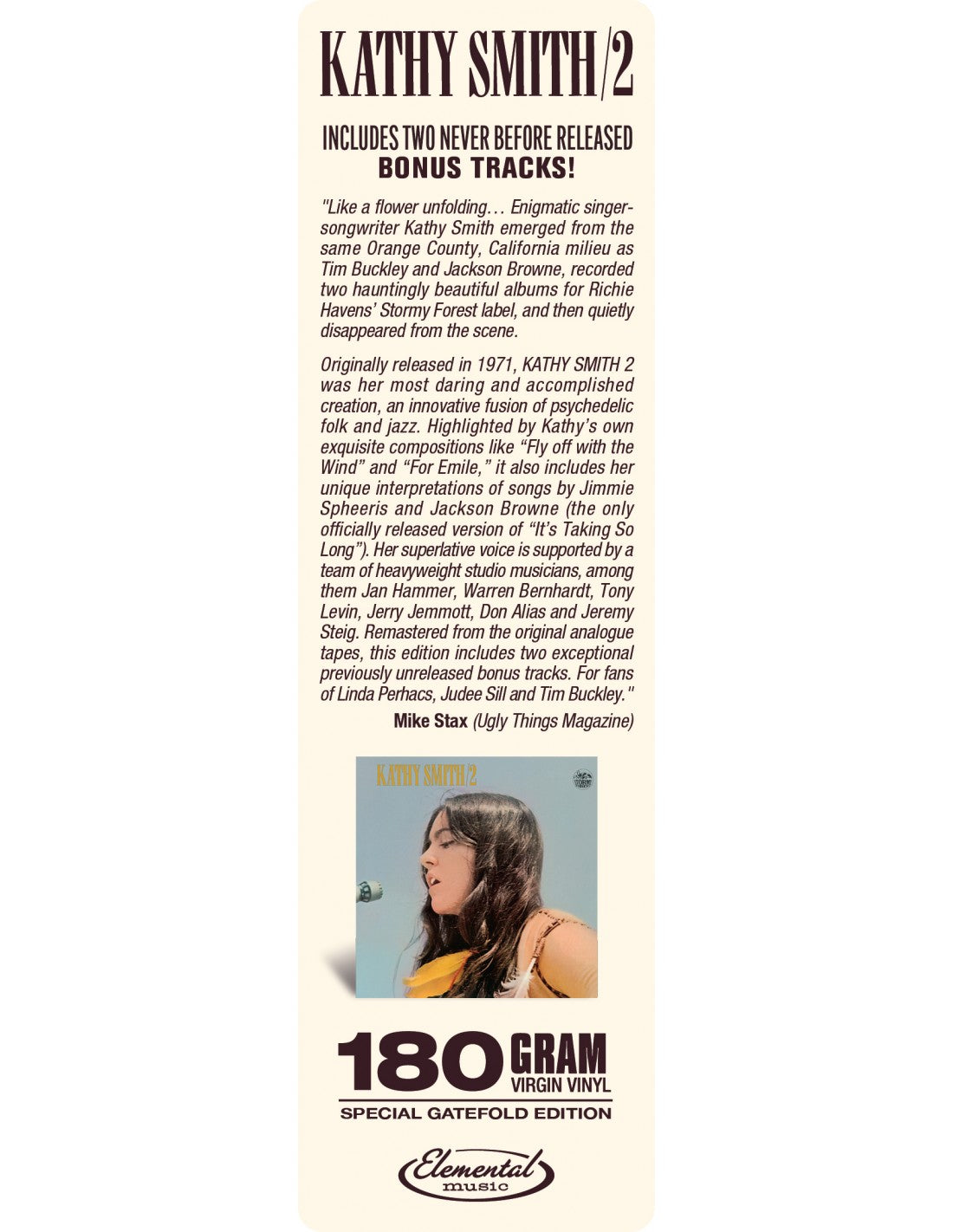 Kathy Smith / 2 (1971) stands as the most daring and accomplished work of enigmatic singer-songwriter Kathy Smith. Emerging from the same Orange County, California scene as Tim Buckley and Jackson Browne, she recorded two hauntingly beautiful albums for Richie Havens’ Stormy Forest label before vanishing from the spotlight. This deluxe 180-gram gatefold reissue restores her visionary fusion of psychedelic folk and jazz.